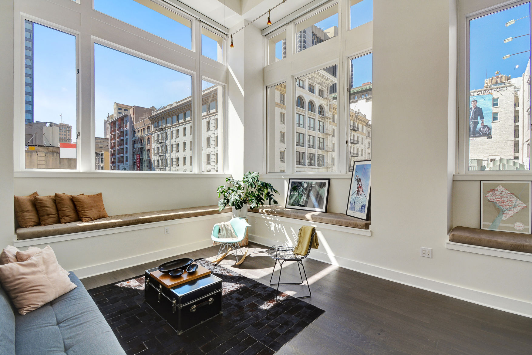 The Odeon is a boutique twenty-nine unit elevator building located in the heart of downtown San Francisco, one block from iconic Union Square, and around the corner from the Powell Street Cable Car. This corner loft-style floor plan is framed on two sides by five huge windows allowing for great natural light and excellent views of the surrounding downtown neighborhood.