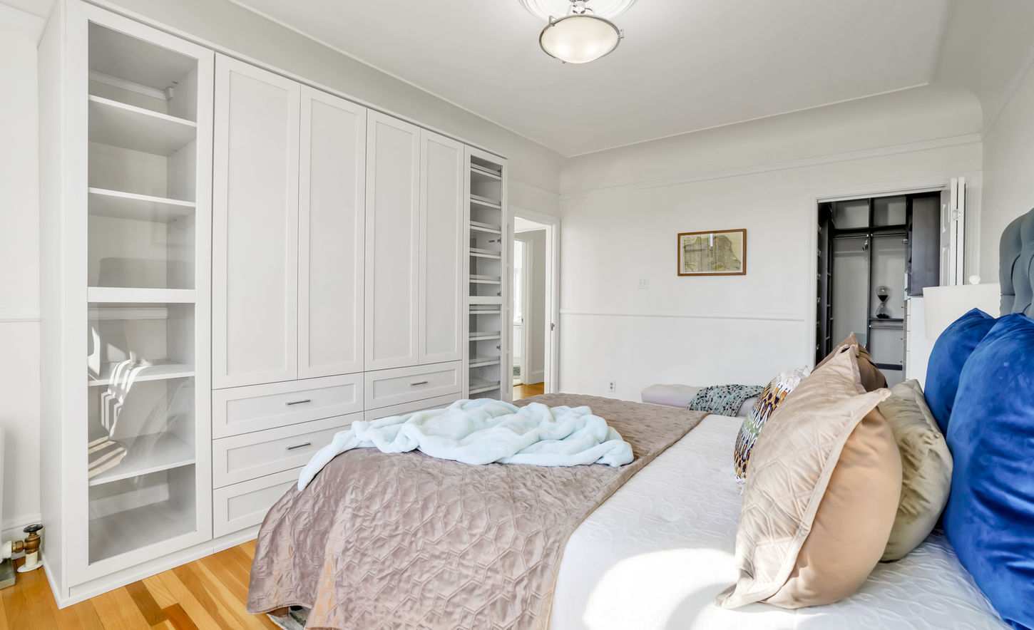 A classic 1924 Edwardian building is home to this generously sized and sophisticated one-bedroom, one-bathroom condo. Situated on the building’s top southwest corner, this bright and beautiful unit features hardwood flooring, fireplace, cove ceilings, crown molding, and a gorgeous muntins detailed bay window. The large living room flows seamlessly into the separate dining area. The super-sized bedroom has ample space for a king-sized bed and enjoys a walk-in closet gorgeously outfitted with custom shelves and a magnificent wardrobe by California Closets.
